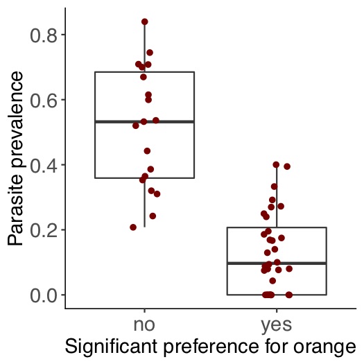 Well… one of the best things about working on guppies is that we know a LOT about them in their natural habitat. People have been out there in the rivers of Trinidad for decades, measuring all sorts of things. Including female preference for orange on their males, and the proportion of fish that are infected at lots of different sites. We might think these two things should be correlated: if females at a site prefer orange males, the data above suggest that they prefer the males with the fewest parasites/no parasites, so transmission might be lower and we’d predict prevalence of the parasite to be lower at the site too. We went through the published data to test if this is the case.. and it looks like the pattern is consistent with this hypothesis (but obviously experiments will help disentangle all the many things that could contribute to this pattern):