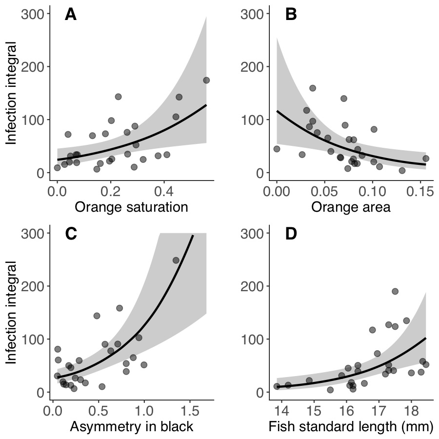 So, I photo’d a lot of male guppies before infecting them and monitoring how they dealt with the infection… and the results suggest that actually some bits of male ornaments do signal parasite resistance! and others signal parasite susceptibility!